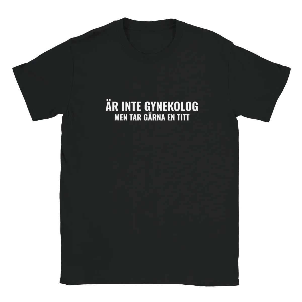 ”Är inte gynekolog – men tar gärna en titt” – T-shirt med maximal grabbhumor