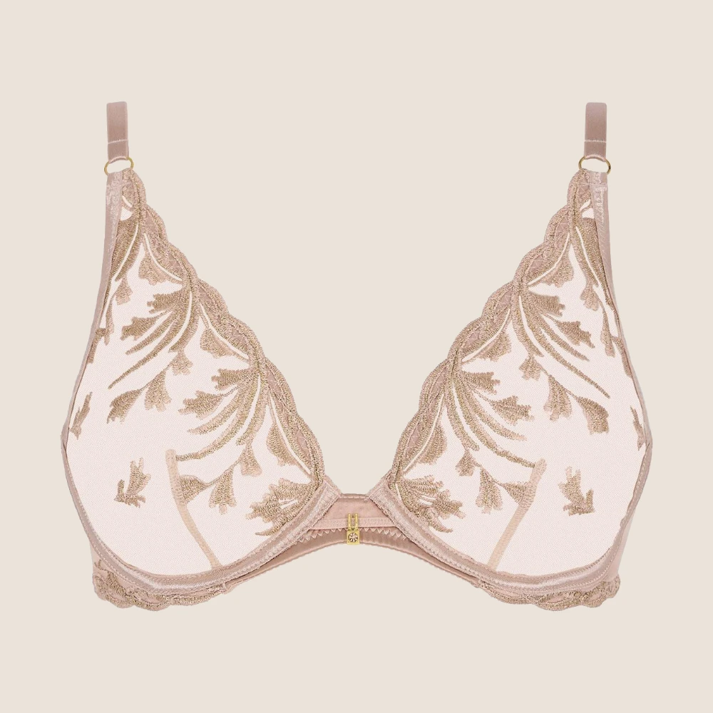 Cosmic Romance Sand Rose triangel-BH med bygel kombinerar en naturlig form med elegant design. Den mjuka rosabeiga basen tillsammans med de gyllene broderade detaljerna ger ett exklusivt och feminint uttryck.