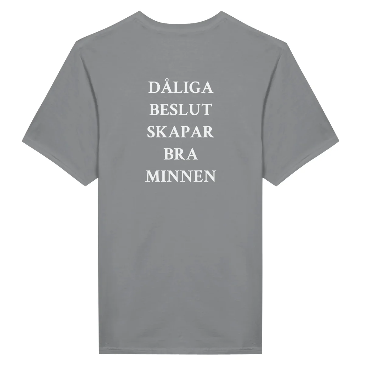 ”Dåliga beslut skapar bra minnen” – T-shirt med livsfilosofi från efterfesten