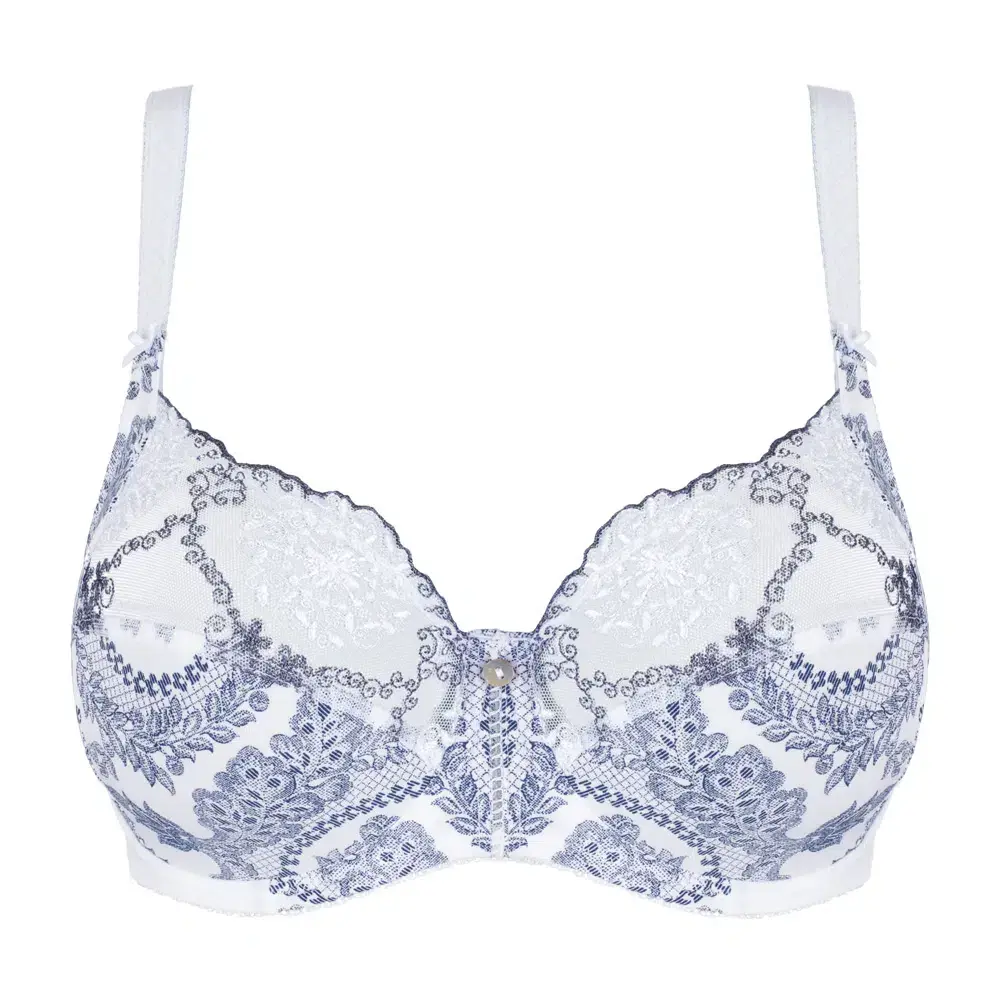 Upplev den lockande och feminina formen av Lily Rose behån med bygel som ger perfekt stöd och komfort. Den magnifika blommiga broderingen i transparent material över den övre kupan och den detaljerade tullefodringen på de nedre kuporna skapar en förtrollande och elegant urringning. Denna ikoniska design strålar avelegans och bekvämlighet. Det mönstrade tyget i en subtil och delikat blå nyans skapar en vacker kontrast mot den rena vita materialet och ger behån en särskild touch av charm.