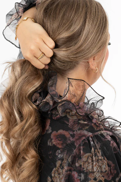 Vi älskar tyll! Monroe Blus är helt unik och verkligen en favorit i höstens kollektion. Yttertyget på blusen är gjort i blommönstrad tyll på svart botten, samt ett svart foder i både ärmen och kroppen. Ledig passform med knappar hela vägen fram, v-ringad öppning och lätt rundad nederkant. Utmed hela halsöppningen och en bit nedan pryds blusen av volymiösa volanger som ger en fin effekt. Ärmen är hellång och har en mjuk resår i handledshöjd följt av en nätt volang.