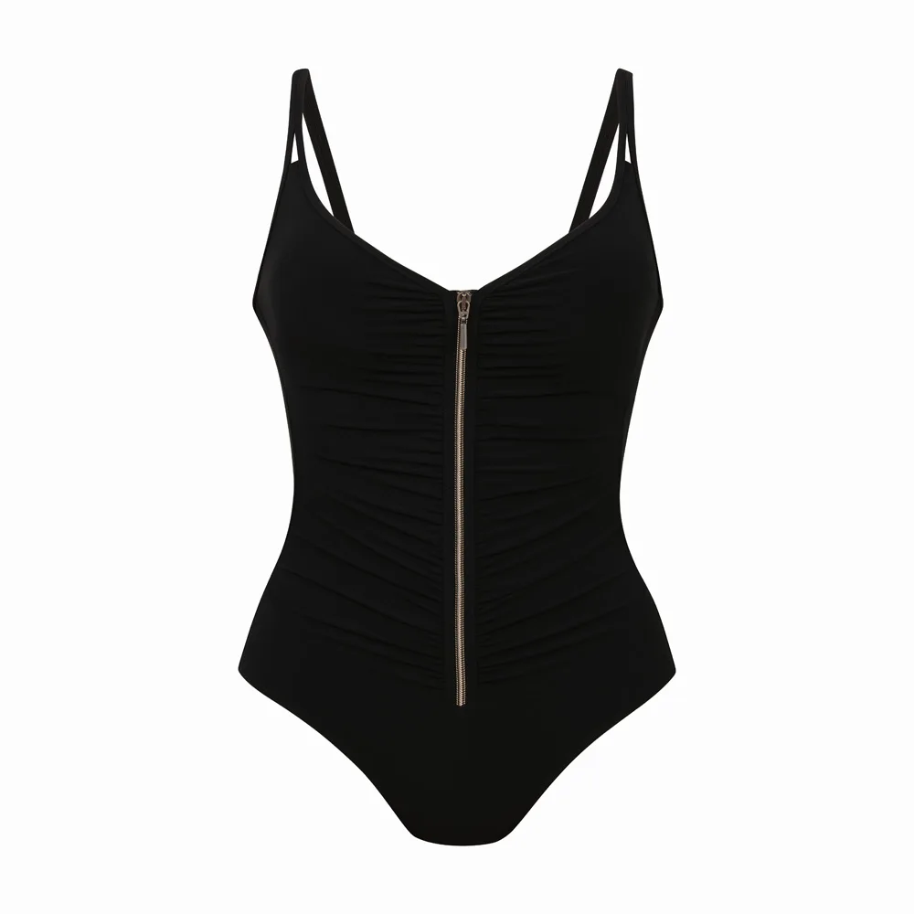 Den slående V-ringningen, de mjuka kuporna och de samlade sektionerna framhäver siluetten på ett elegant sätt. Men det som verkligen fångar ögat är den långa dragkedjan framtill, vilket ger en unik och iögonfallande detalj till denna baddräkt.