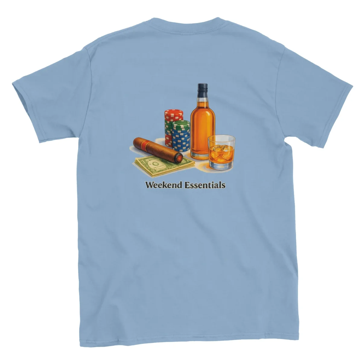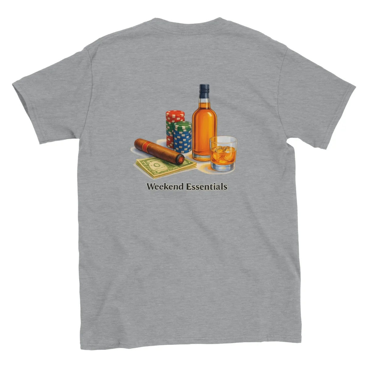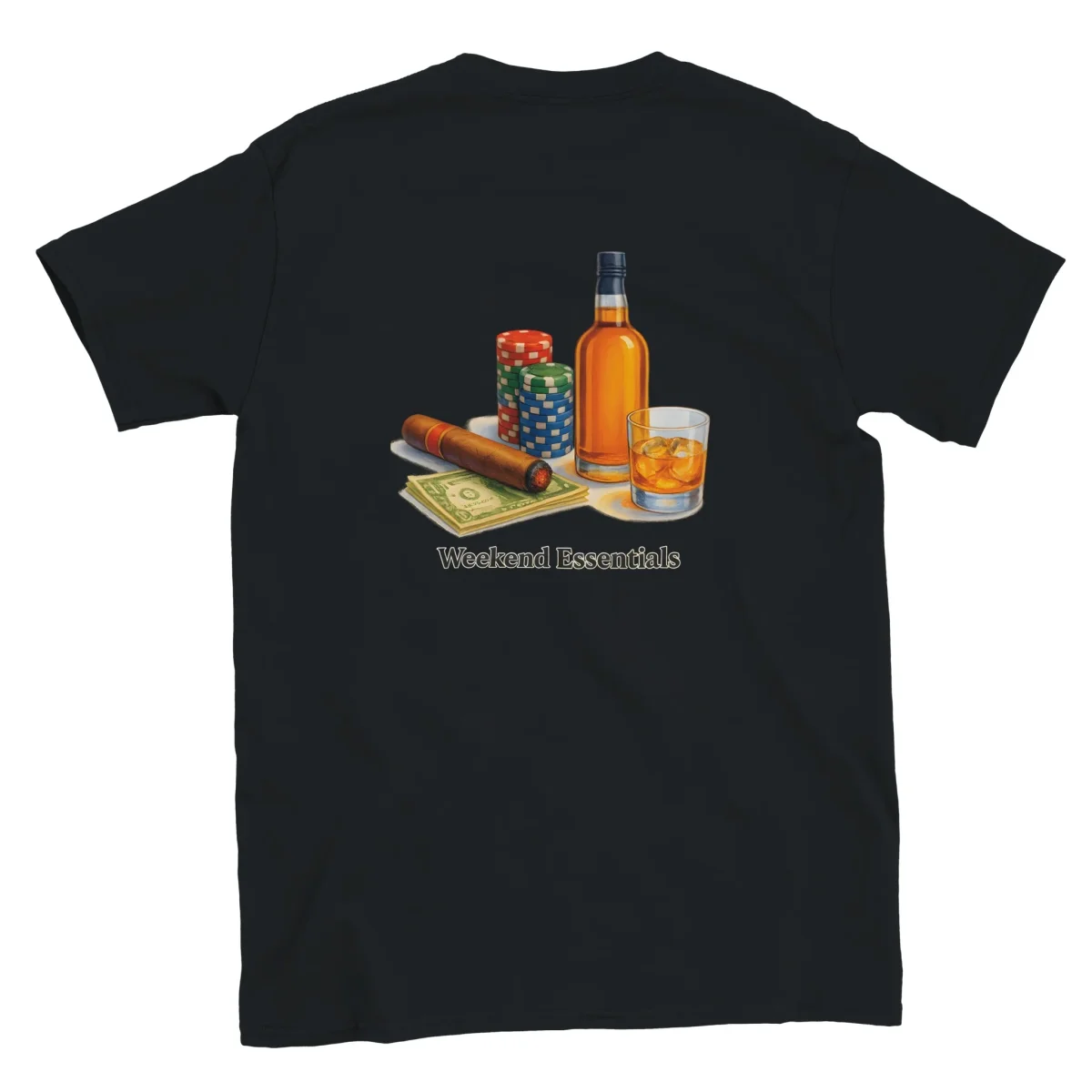 Weekend Essentials är t-shirten för dig som tar helgen på allvar – whiskey, cigarr, poker och cash i ett och samma tryck. En humortröja som sticker ut och passar lika bra på förfesten som runt pokerbordet.
