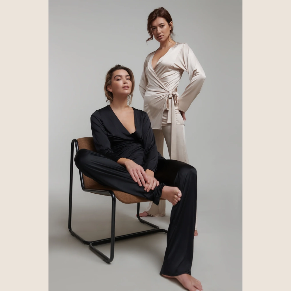 Zoe Jacket är designad för att matchas med PJ Delux eller Zoe Pants men fungerar lika fint som ett fristående plagg i en genomtänkt loungegarderob. Ett plagg som rör sig mellan komfort och glamour och snabbt blir en personlig favorit.